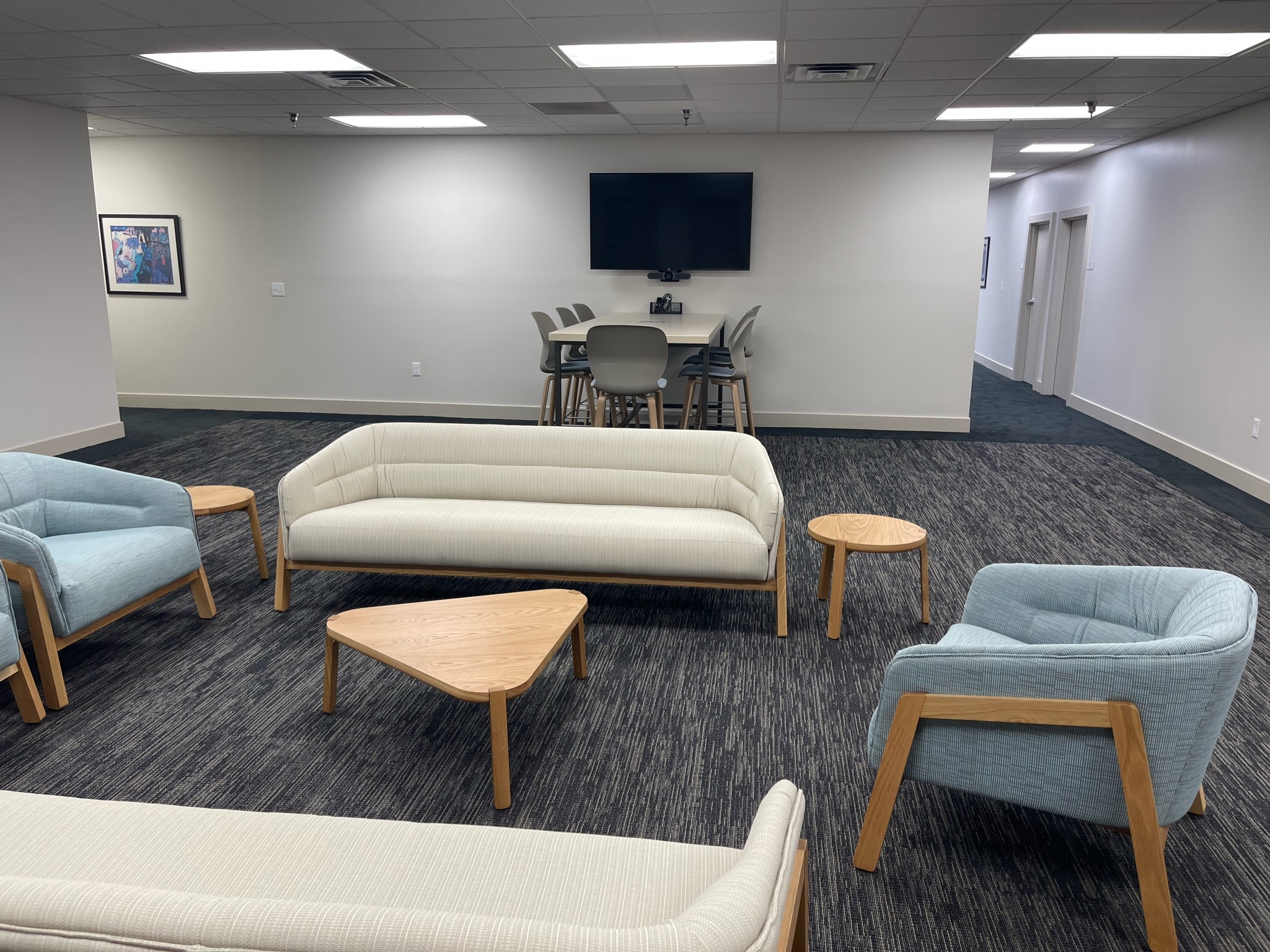 In addition, we designed two smaller satellite huddle rooms. Each room is equipped with a 55″ TV, HDMI sharing, and a Logitech Meetup system, creating an ideal environment for quick, spontaneous collaborations. The Meetup system offers high-quality video conferencing in a compact, all-in-one unit designed for smaller spaces.