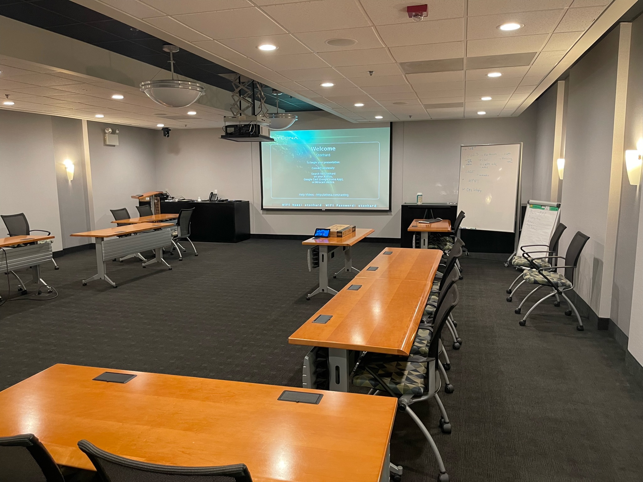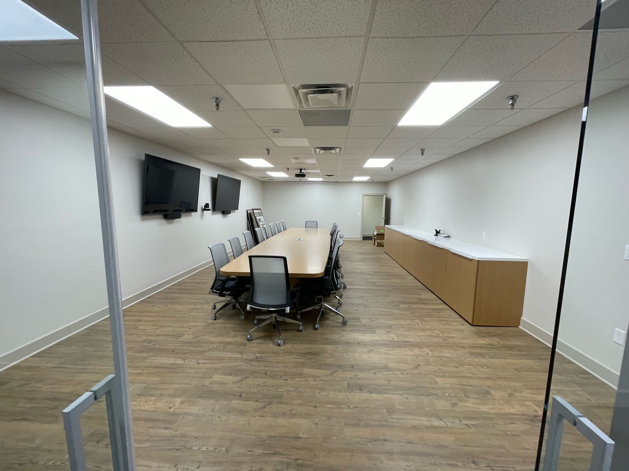 To accommodate both large meetings and training sessions, we installed two 75″ TVs for simultaneous displays and a projector with a drop-down screen, making the space versatile and dynamic.